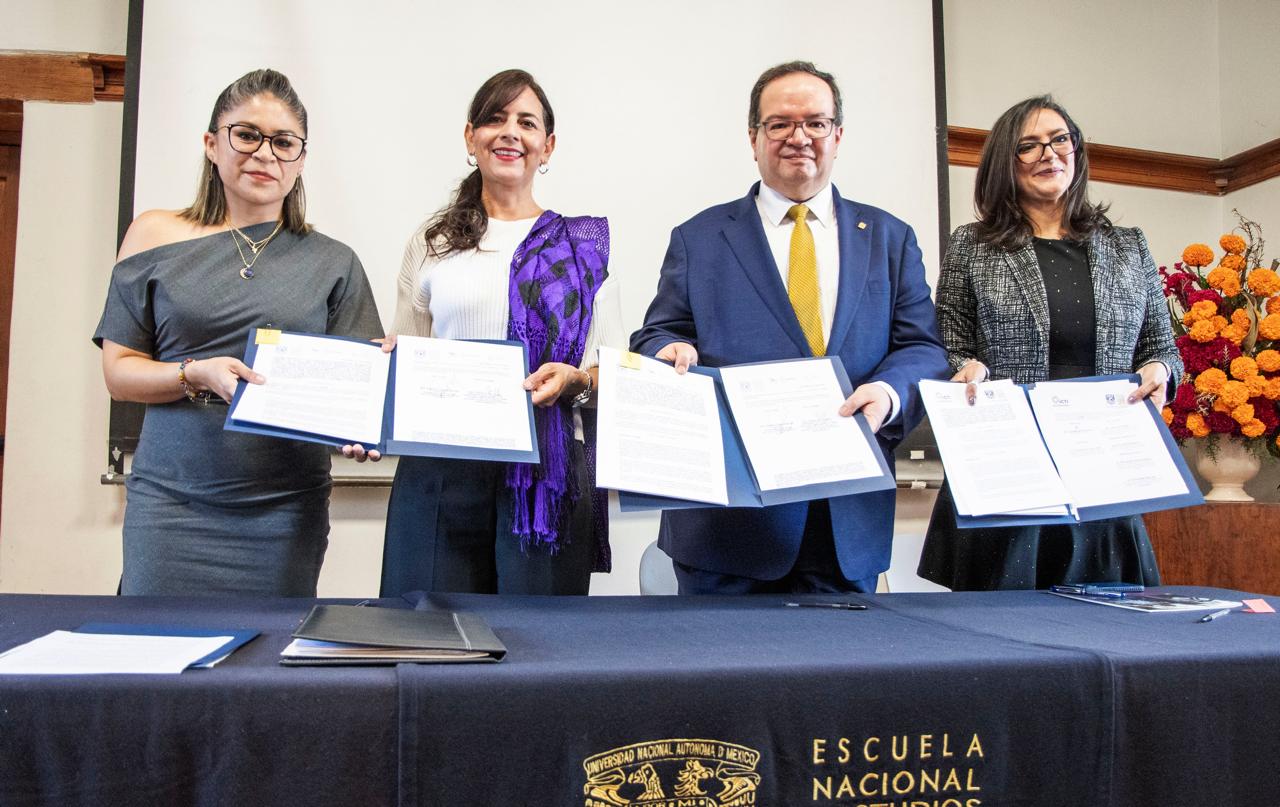 La secretaria de Educación, Gaby Molina; el rector de la UNAM, Leonardo Lomelí Vanegas; y la directora de la ENES, Yunuén Tapia Torres, coincidieron en la importancia de sumar esfuerzos para el fortalecimiento, difusión y defensa del derecho de las comunidades indígenas a su autonomía.